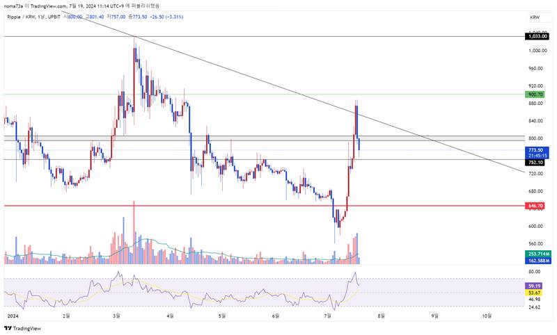 SEC와의 합의 불발에도 불구하고 리플의 거래량은 시가총액 1위인 비트코인(237, 142백만 원)을 뛰어넘어 624,447백만 원을 기록하고 있습니다(2024. 7. 19. 업비트 기준). 이는 리플의 매도압력에도 불구하고 가격하락을 막고 추가적인 상승여력을 비축하고 있는 것으로 판단할 수 있습니다.
